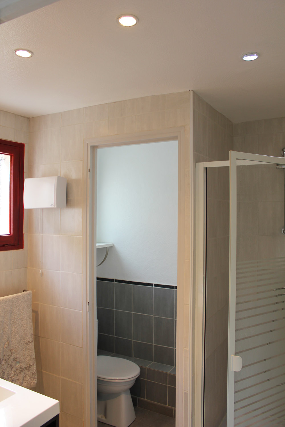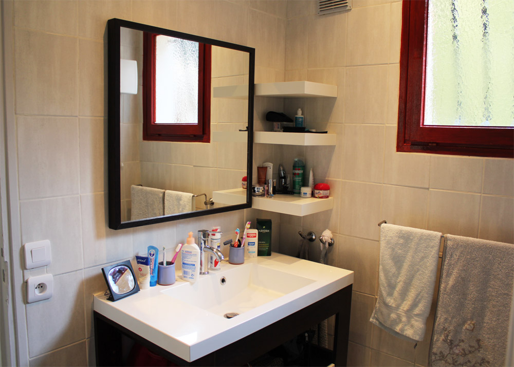 La salle de bains est située en rez de chaussée. Elle est composée d'une douche, d'un espace toilette avec lavabo, miroir, rangement et d'un WC séparé.