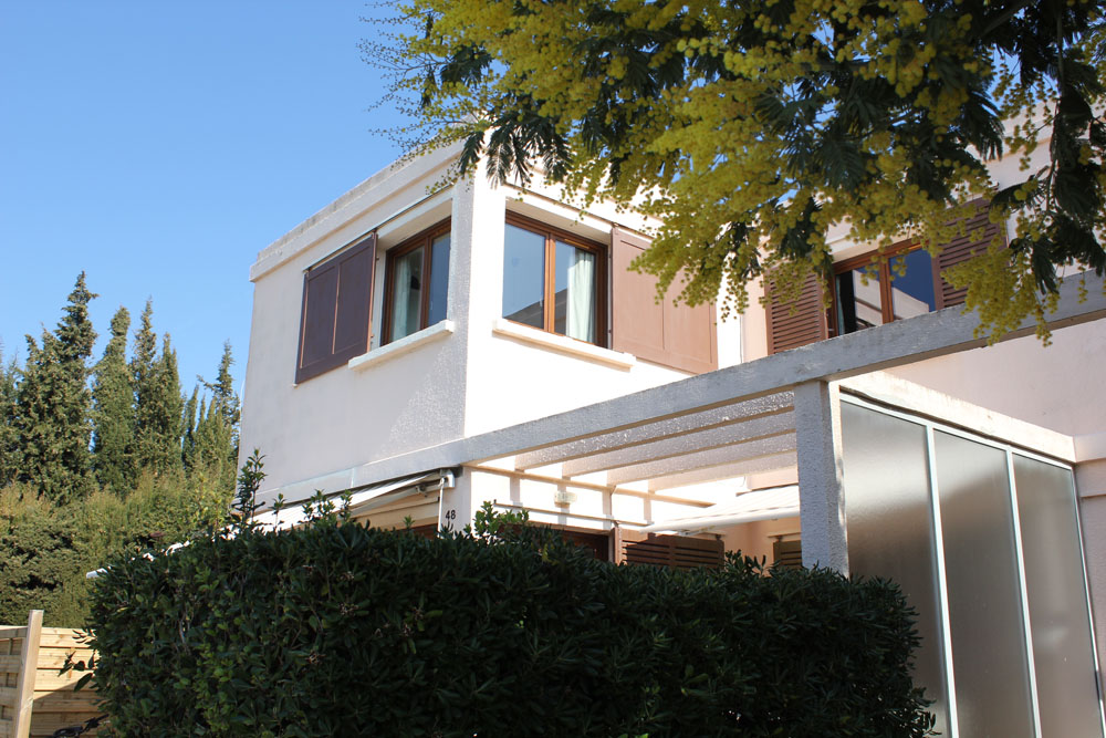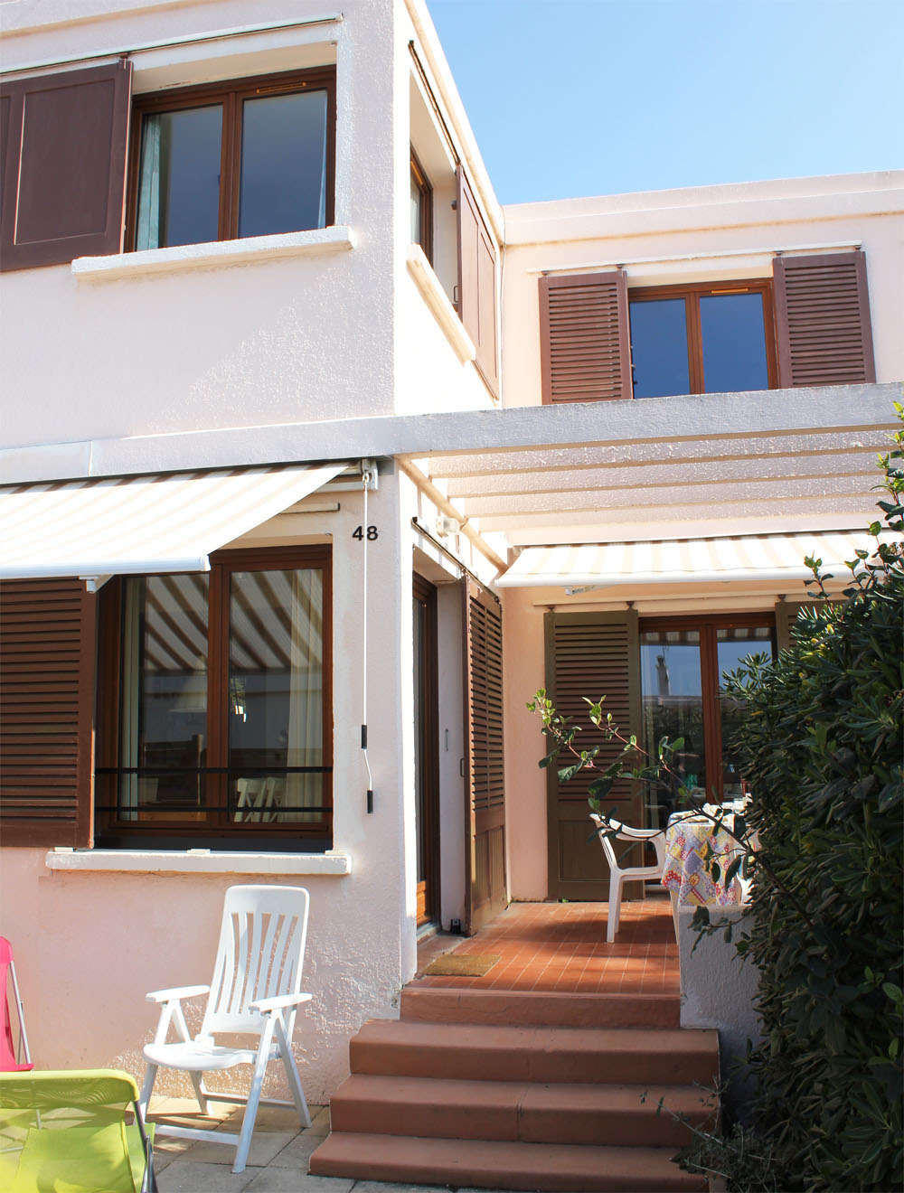 Donnant sur l'extérieur grâce à une double porte vitrée, vous accédez directement sur la 1ère terrasse, où vous pouvez prendre les repas. Puis dans la continuité, en descendant quelques marches, vous arrivez à une seconde terrasse ou un petit salon de jardin vous attend pour le farniente.